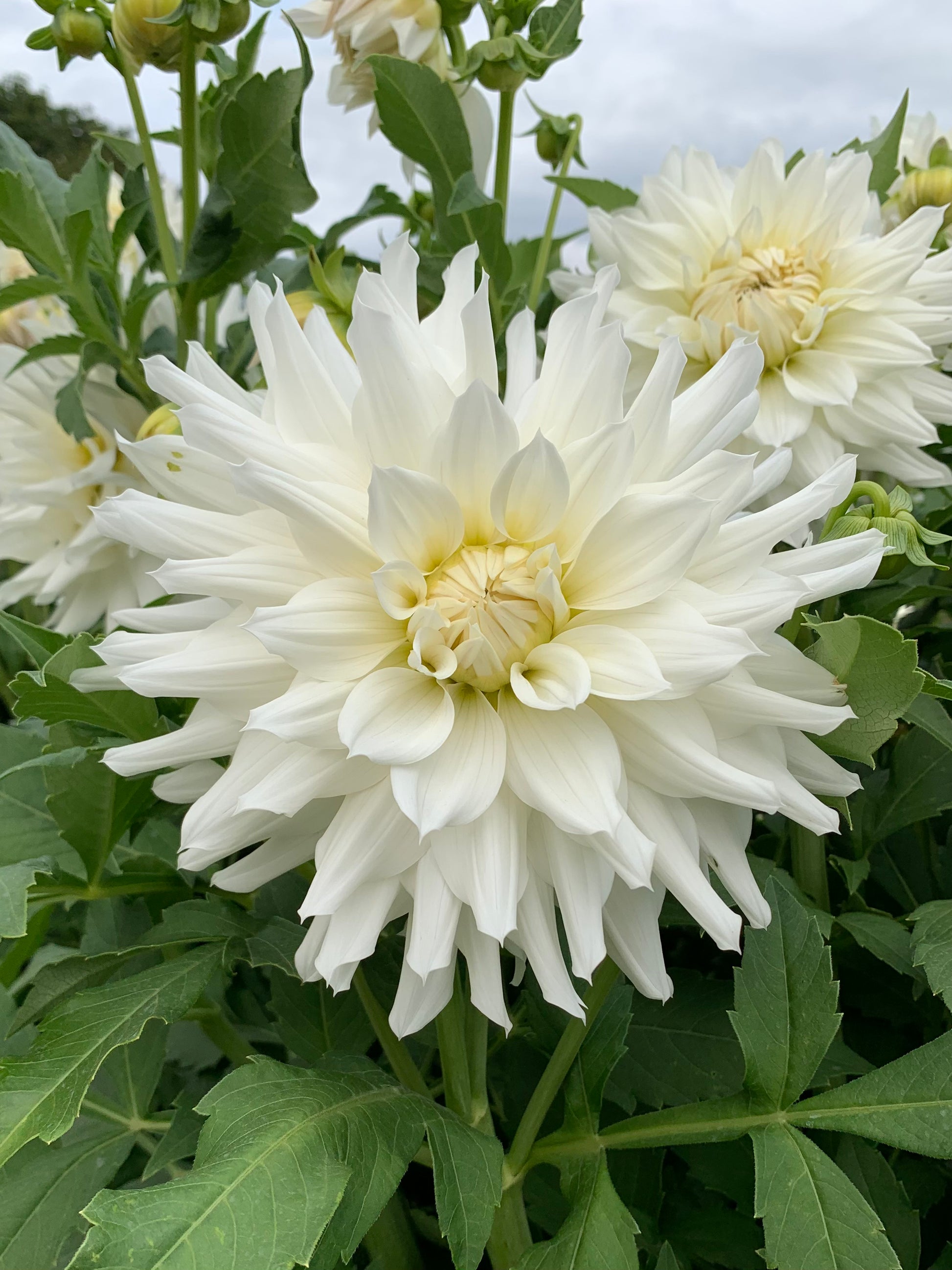 Nice Bright white colour. An 8" ID Love the very faint blush in center. Good texture. Lots of blooms. You'll love the compact form showy 4' plant.
